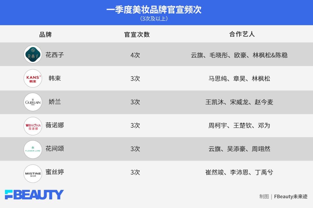一季度已有7个品牌官宣3次及以上的艺人合作。比如花西子4次官宣,分别覆盖云旗、毛晓彤、欧豪以及林枫松与陈稳的双人组合;韩束则通过马思纯、章昊、林枫松分别承担话题制造、海外试探和年轻化触达的功能。