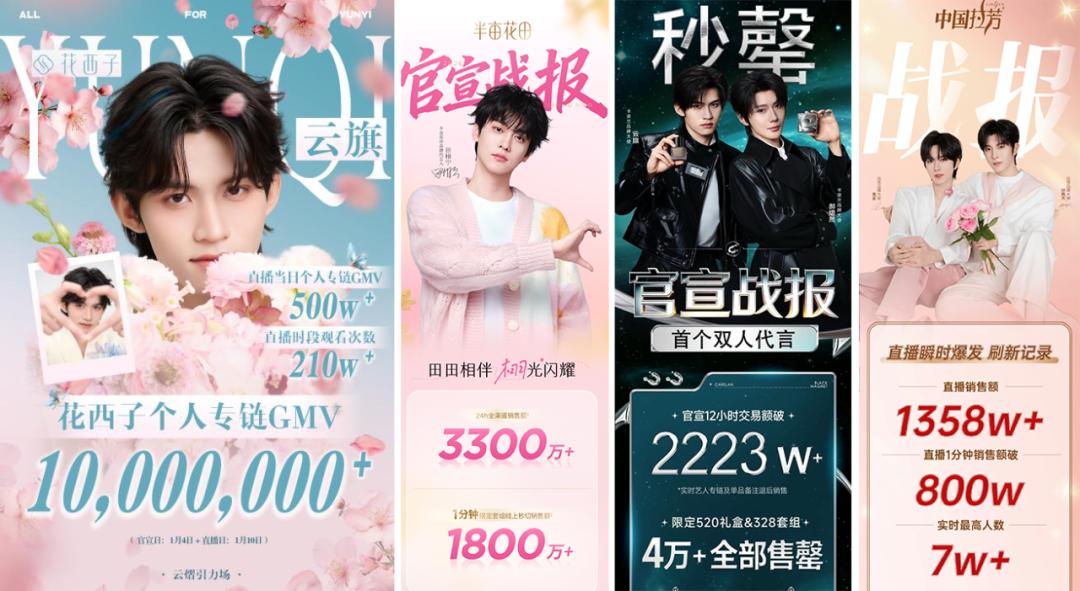 品牌官方数据显示,云旗代言花西子,直播当日个人专属链接GMV达500万元,官宣日加直播日累计突破1000万元;田栩宁代言半亩花田,官宣后24小时销售额超3300万元。