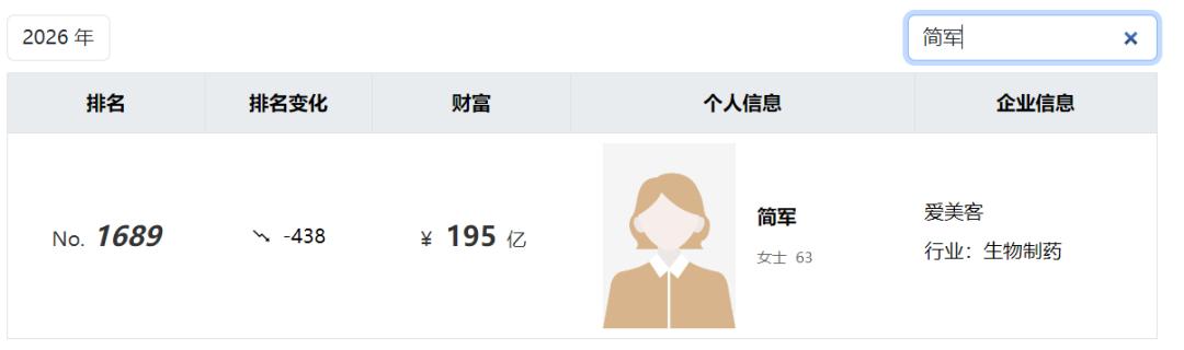 从41岁跨界入行到身家超五百亿,她用了17年;但从巅峰滑落,不到四年。2026年胡润全球富豪榜上,简军身家已缩水至195亿元。