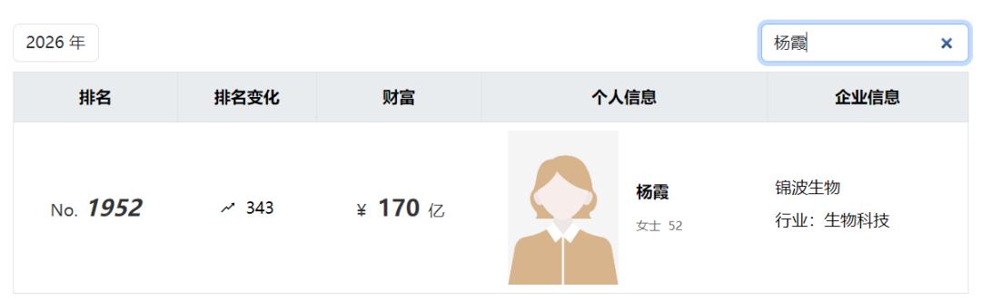 2025年杨霞以115亿身家成为“山西女首富”;2026年胡润全球富豪榜上,她的身家涨至170亿。