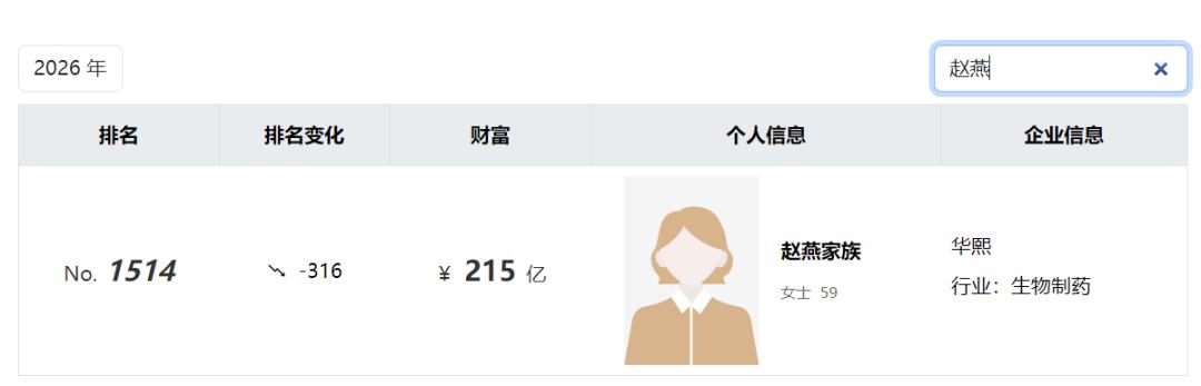 如今,胡润榜单上,赵燕家族财富从2021年的650亿跌至2026年的225亿,蒸发425亿,排名从240名滑至1198名。