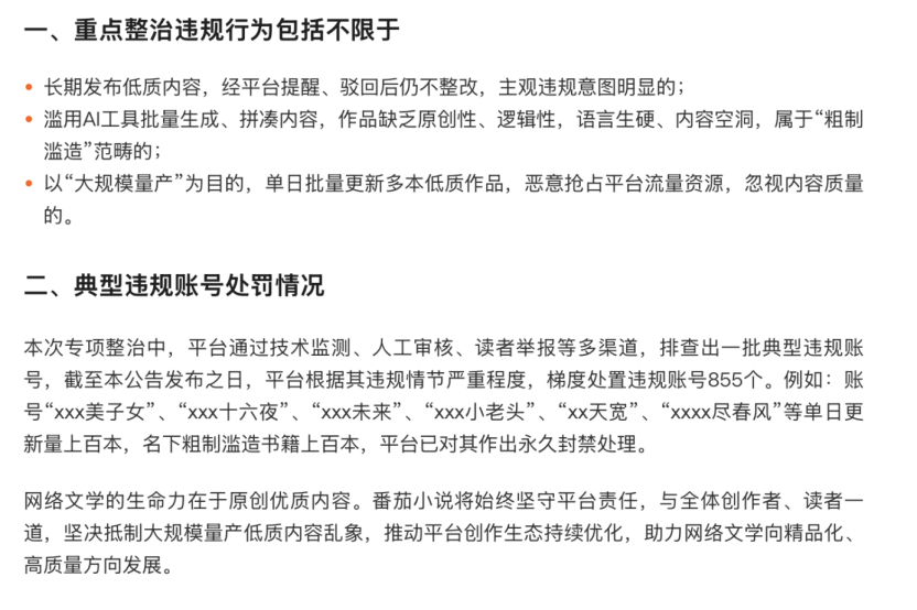 2026年2月,该平台发布公告,指出部分账号滥用AI技术进行大规模批量创作,有违规账号单日更新上百本作品,平台最终对855个账号进行了梯度处置。