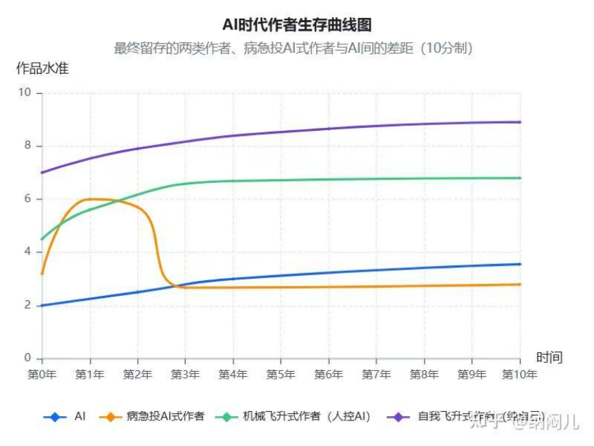 近期在知乎上有一张《AI时代作者生存曲线图》(作者纳闷儿)显示,前AI时代的头部作者竞争主要围绕更新速度和套路熟练度展开;后AI时代,头部作者群体正呈现出两种截然不同的创作路径。