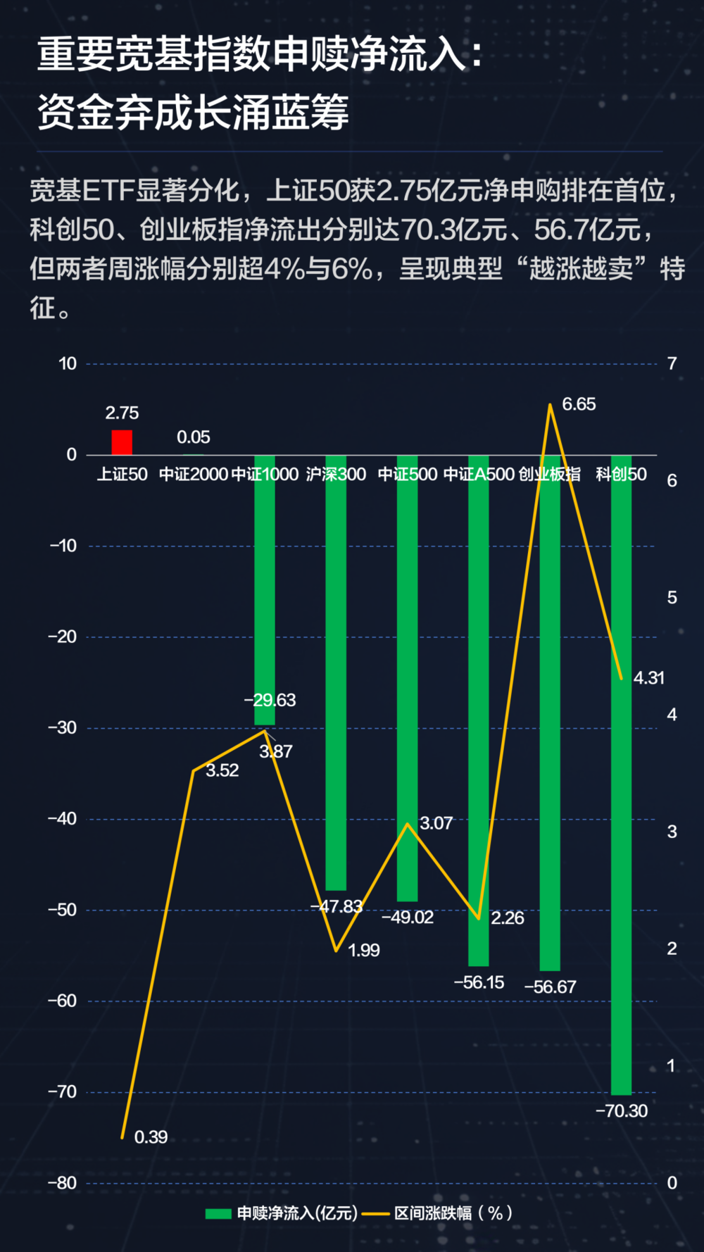 宽基指数ETF内部分化明显:上证50获得2.75亿元净申购,排在首位,科创50、创业板指净流出分别达到70.3亿元、56.7亿元,但这两者的周涨幅分别超过4%和6%,呈现出典型的“越涨越卖”特征。