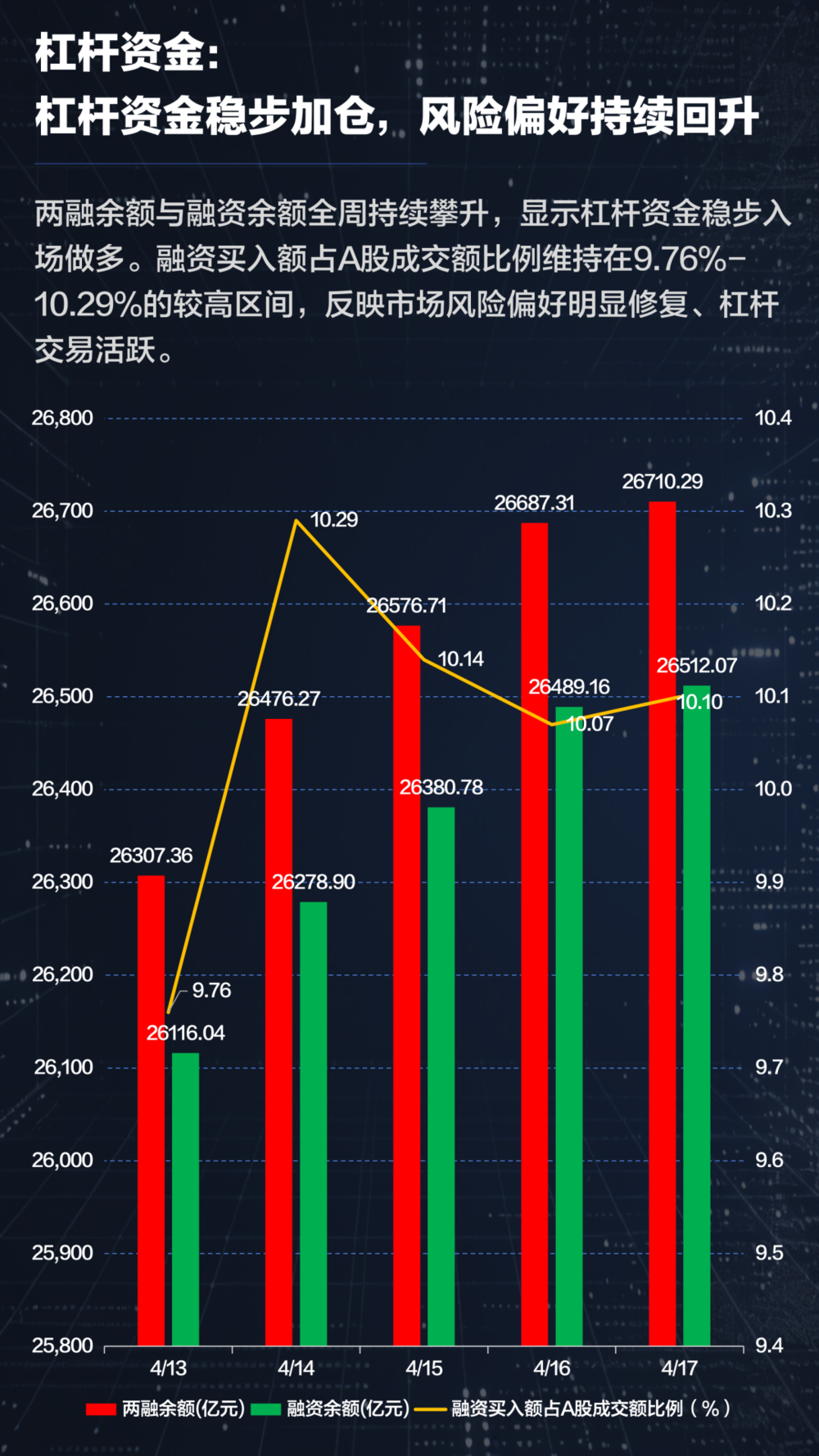 杠杆资金稳步进场做多,两融余额和融资余额全周持续上升,市场风险偏好明显回升。