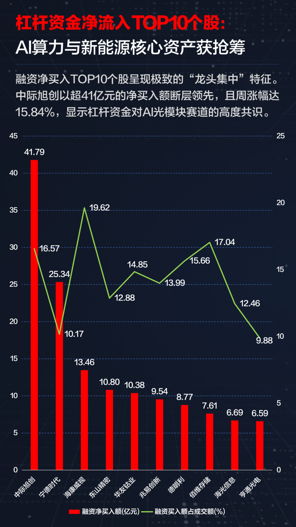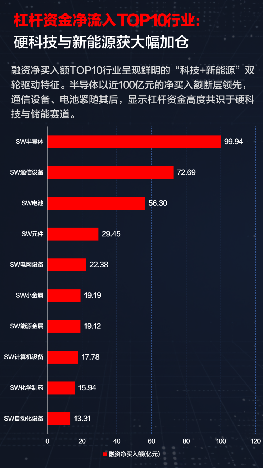 融资净买入额TOP10行业呈现出清晰的“科技+新能源”双轮驱动特征,半导体以近100亿元的净买入额遥遥领先,通信设备、电池紧随其后,显示出杠杆资金对硬科技与储能赛道的高度认可。