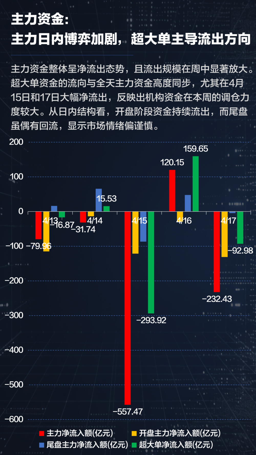 主力资金整体处于净流出状态,而且流出规模在周中明显扩大。超大单资金的流向与全天主力资金高度一致,4月15日和17日出现了大幅净流出,反映出机构资金调仓的意愿十分强烈。从日内资金流动结构来看,开盘阶段资金持续流出,尾盘虽然偶尔有资金回流,但难以改变整体谨慎的态势。