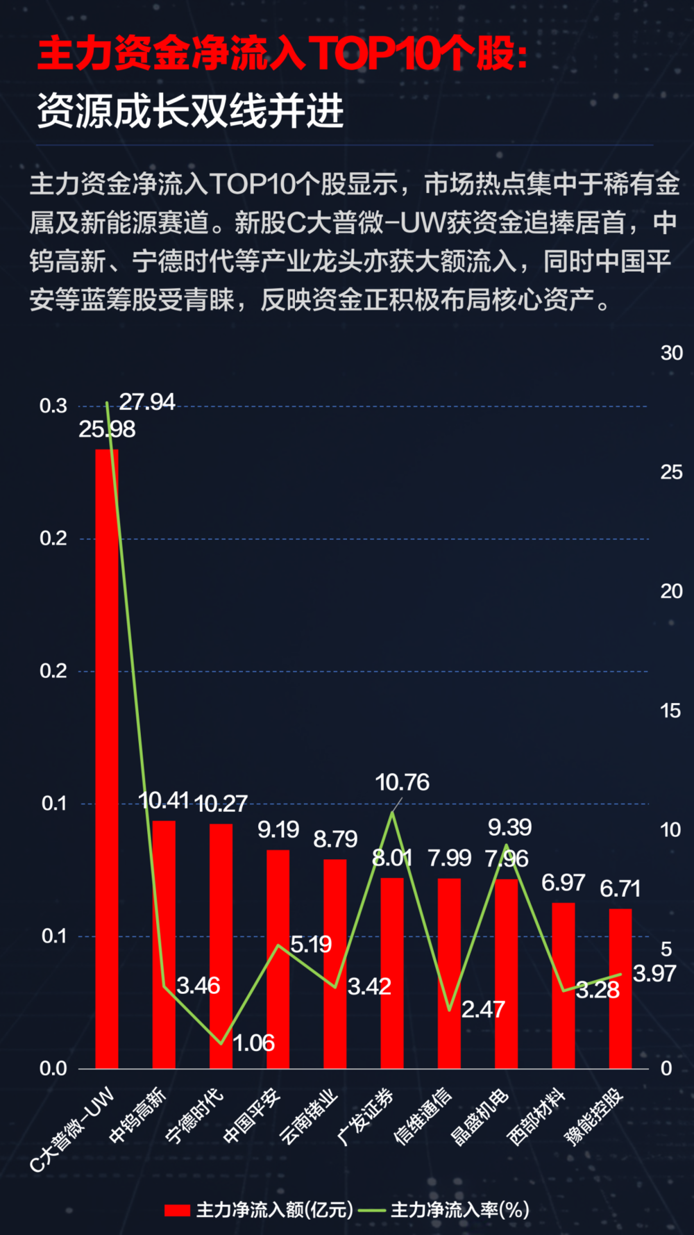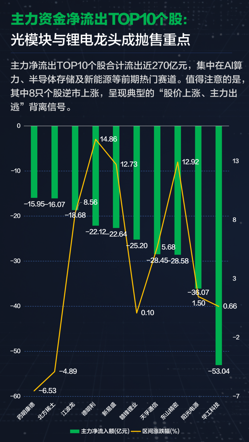散户资金净流出方面,次新股和新能源成为减持的重灾区,净流出前十的个股合计流出超过60亿元,其中次新股及创业板标的换手率高达50%至150%,说明散户在短线炒作后快速获利了结;新能源产业链也遭到抛售,反映出散户对行业短期景气度的谨慎预期。