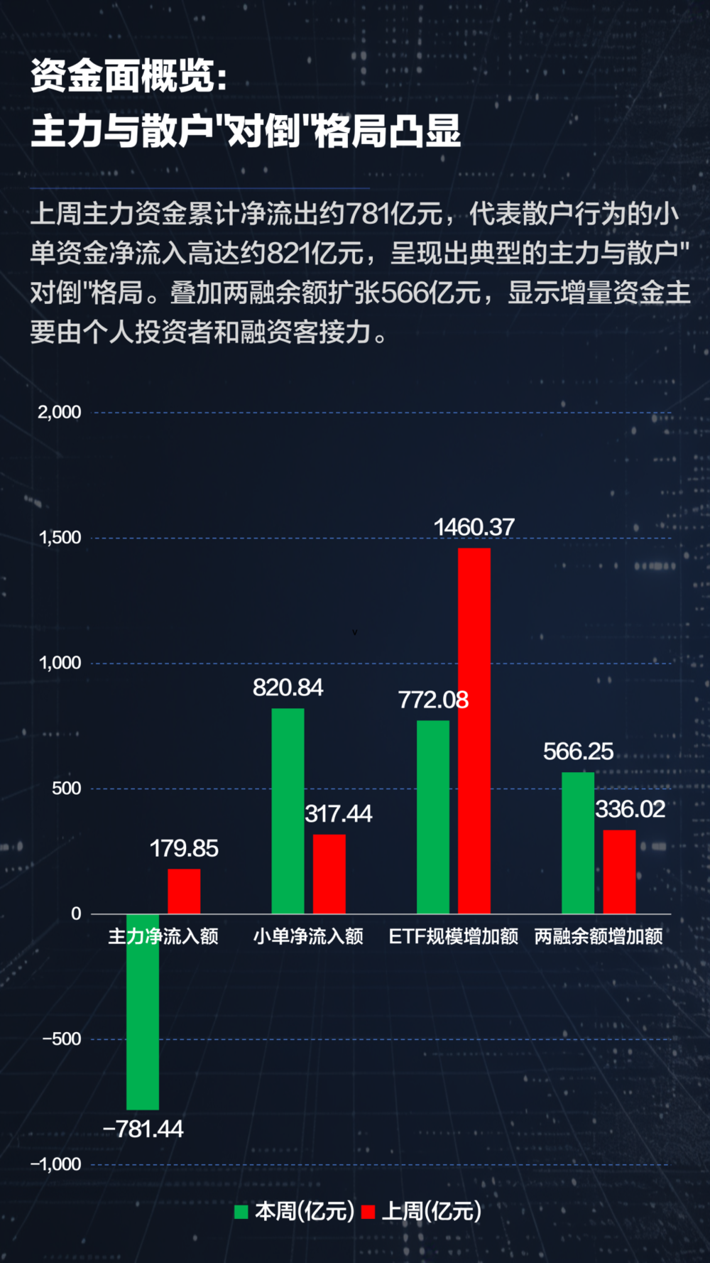主力资金累计净流出约781亿元,与之形成鲜明对比的是,代表散户行为的小单资金净流入达到了约821亿元,呈现出典型的主力与散户“对倒”格局。再加上两融余额增加了566亿元,说明增量资金主要来自个人投资者和融资客的接力。