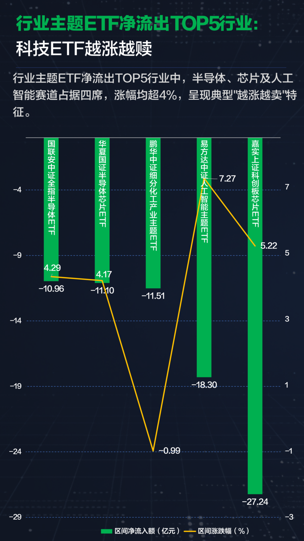 在行业主题ETF方面,卫星ETF以22亿元的净流入和8.21%的涨幅位居榜首,电网设备ETF获得19亿元增持;而半导体、芯片及人工智能赛道占据了净流出TOP5中的四个席位,且周涨幅都超过4%,同样呈现出“越涨越赎”的特征。