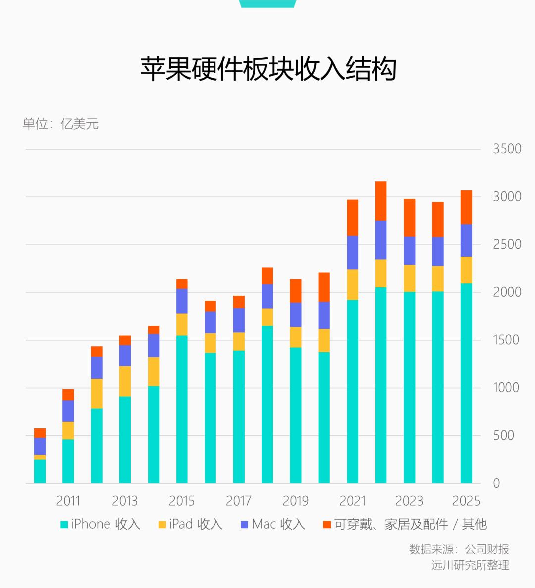 包括Apple Watch、AirPods、Home Pod等。虽然这些产品在硬件收入中的占比一直不到10%,却是苹果生态的重要组成部分。