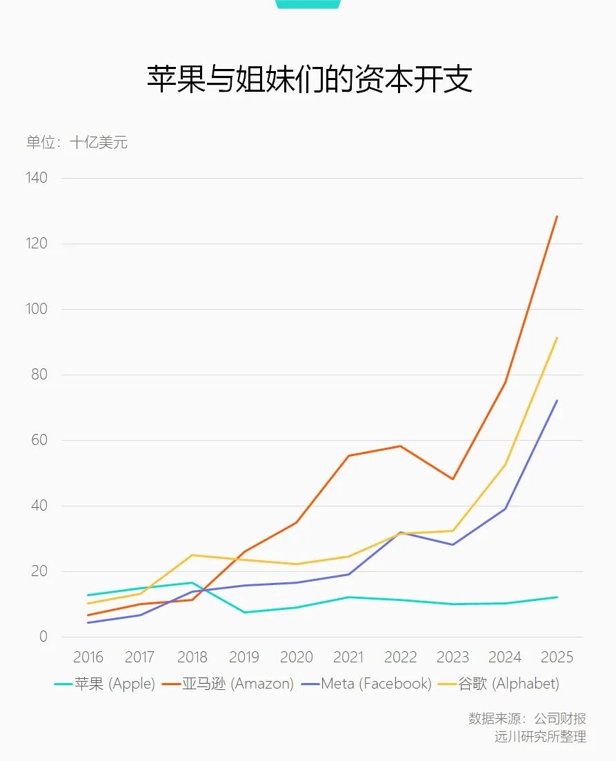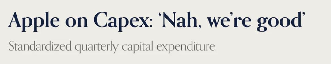 硅谷科技公司疯狂采购GPU的那几年,苹果的资本开支水平长期只有同行的1/10左右,以至于风投机构a16z发出了这样的嘲讽: