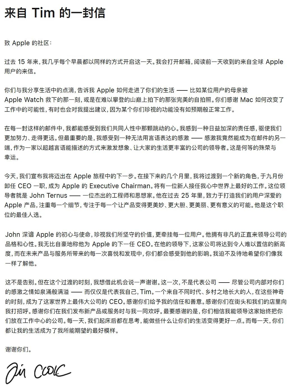 今日,现任苹果CEO库克向全球用户发布感谢信,宣布特努斯将接任苹果下一任CEO,自己则转任董事会执行董事长,该任命自9月1日起正式生效。