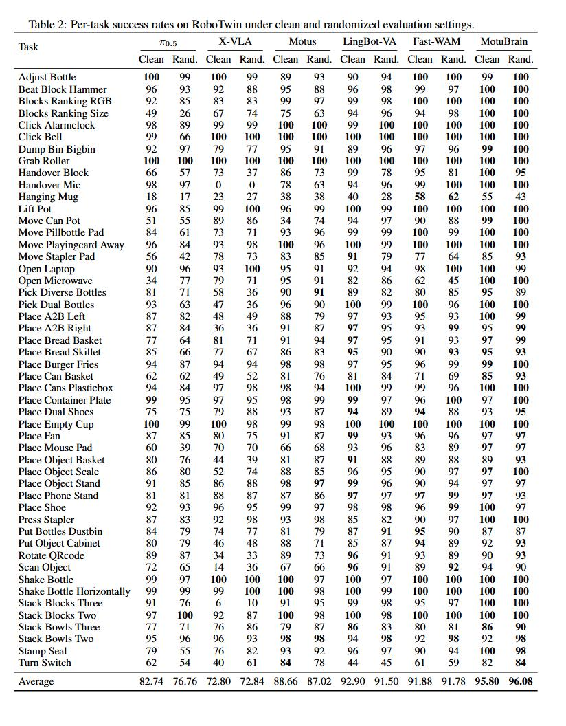 在更侧重任务执行的RoboTwin中,这种优势进一步放大。面对50个任务、两种环境设置,MotuBrain平均得分达96.0,显著高于第二名的92.3,领先幅度几乎相当于第二名到第五名的差距。