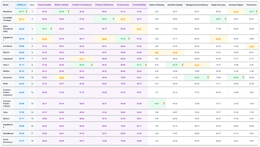 在WorldArena中,MotuBrain以63.77的总体EWM Score位居第一,表现超越高德ABot、极佳GigaWorld-1等模型,在Motion Quality、Flow Score、Motion Smoothness等关键运动维度全面领先。