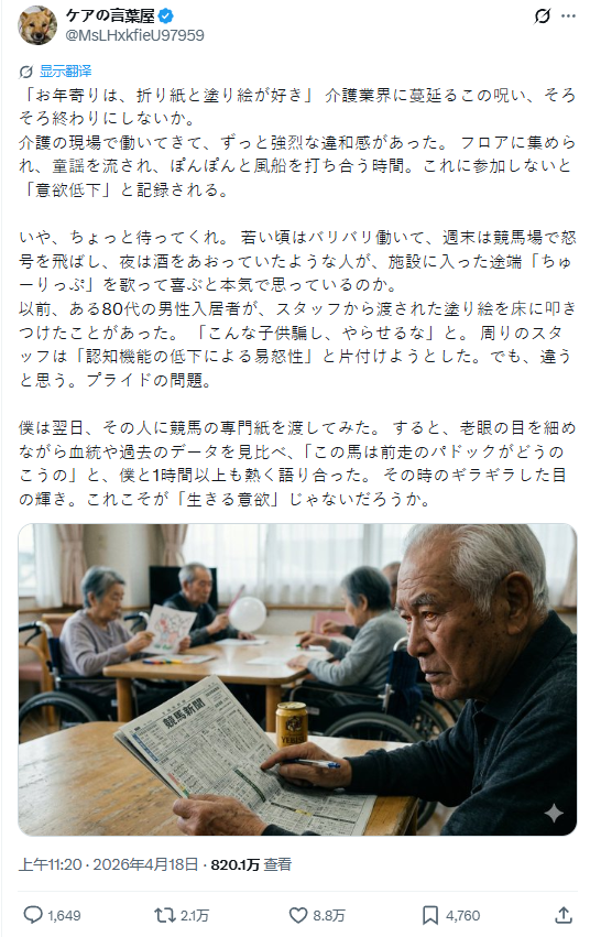 他描述了这样的场景:老人们被集中到大厅,听着童谣,玩气球拍打游戏。不参与就会被记录为“积极性不高”。他质疑:那些年轻时努力工作、周末去赛马场呐喊、晚上畅饮的老人,进入养老机构后,难道就该突然喜欢唱《郁金香》(日本童谣)吗?