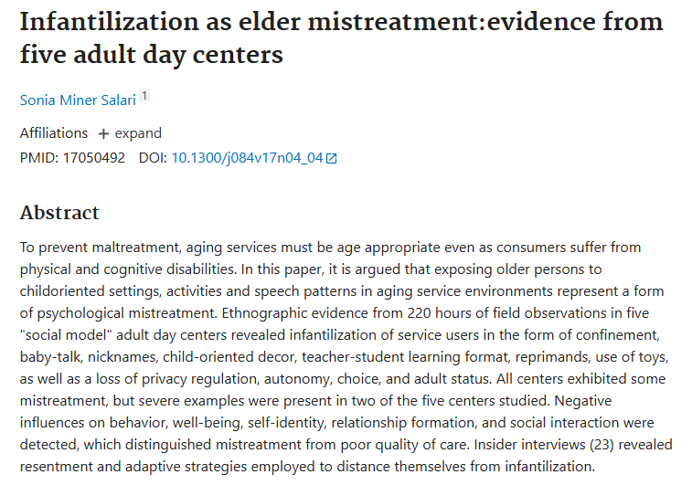 相反,幼儿化活动(比如强制集体唱童谣、涂色)被看作是一种心理虐待,会伤害老人的自尊、自我认同,导致抵抗护理行为增加,甚至加快功能衰退。
