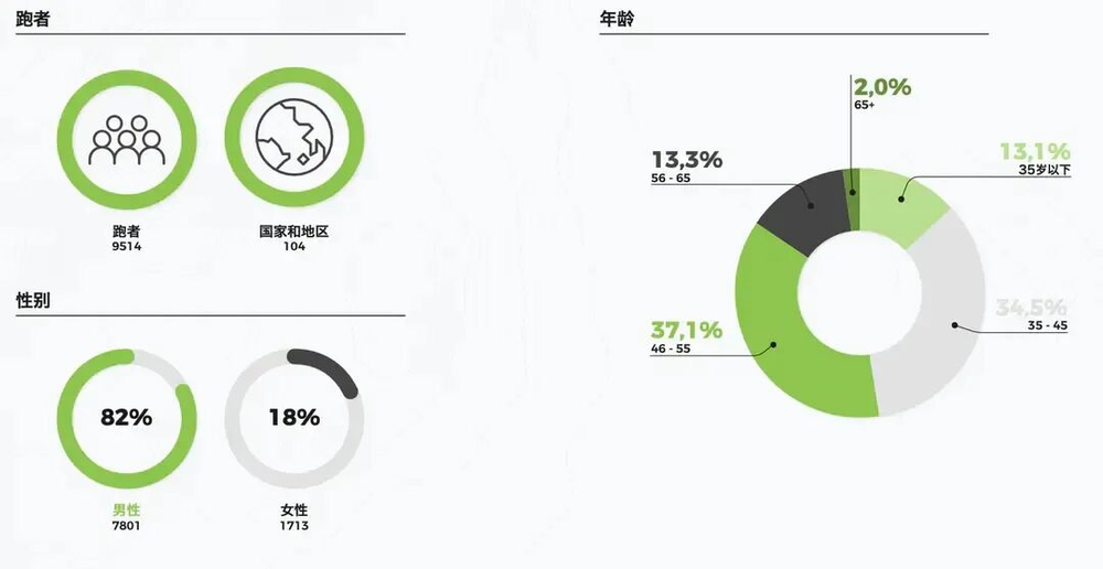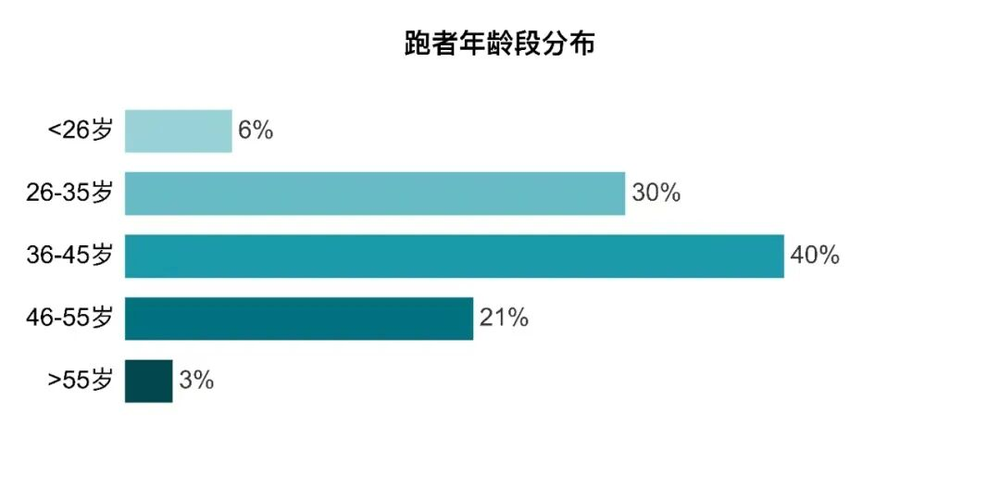 国际越野跑协会ITRA2021年针对全球104个国家超9500名跑者的《全球越野跑者调研报告》显示,全球越野跑者平均年龄40岁,35-45岁占比34.5%,46-55岁占比37.1%。中国越野跑者虽更年轻,但36-45岁仍是中坚力量。
