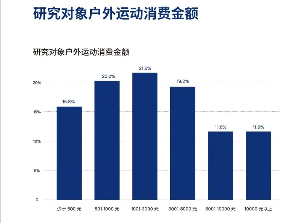 除了人数与成绩,中年人在装备上也具优势。精练GymSquare《2023中国健身和健康生活方式行业报告》显示,户外运动消费在501-1000元、3001-5000元区间的人群占比分别为20.2%和21.6%,超1万元的占11.6%,高于消费少于500元的15.8%,呈现高客单趋势。