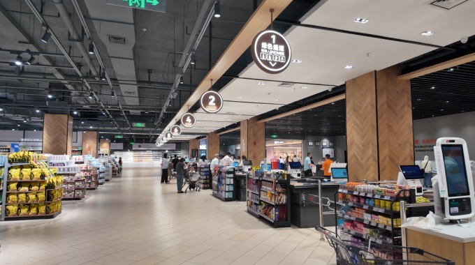 为提升顾客购物体验,门店打破传统卖场的强制动线设计,去除所有商业性束缚,对空间布局进行科学规划。主通道与货架之间的间距均做了加宽处理,货架高度也相应降低,以此营造出通透、整洁且明亮的购物环境——过道宽敞无拥挤感,灯光柔和不刺眼,空气保持清新自然。