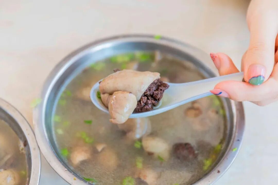 制作大肠血选用的是质地厚实的大肠头,吃起来并非软烂口感,而是富有嚼劲。咬下的瞬间,猪血在口中迸发,外韧里嫩,让人回味无穷。