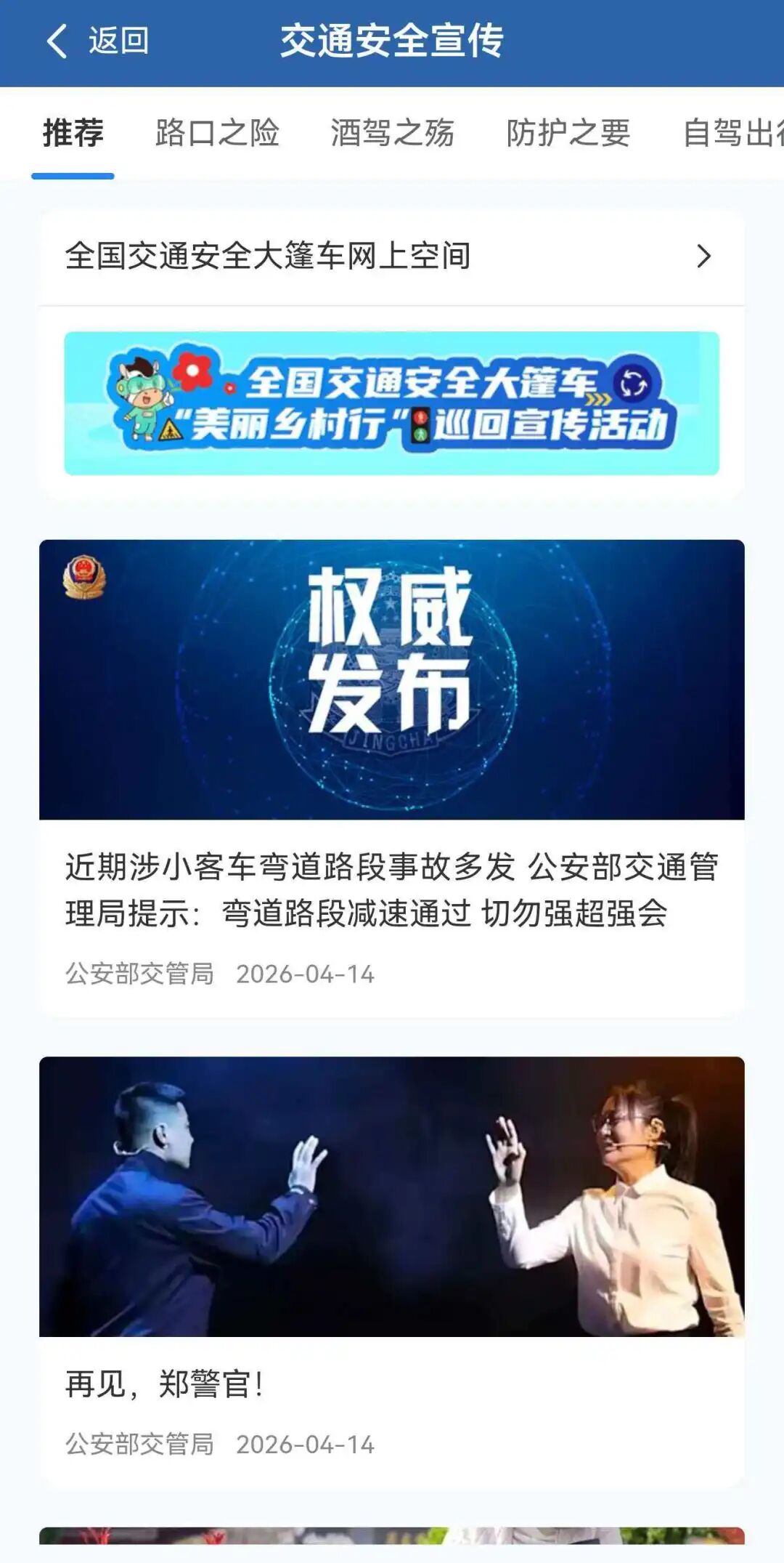 为持续强化线上交通安全宣传阵地建设,实现交通安全宣传教育的精准化推进,“交管12123”APP的“交通安全宣传”板块进行了内容扩容。在原有新驾驶人、自驾出行、亲子课堂、银龄课堂四个栏目的基础上,新增加了“路口之险”“酒驾之殇”“防护之要”三个特色栏目。