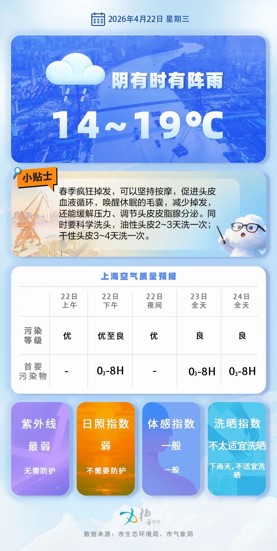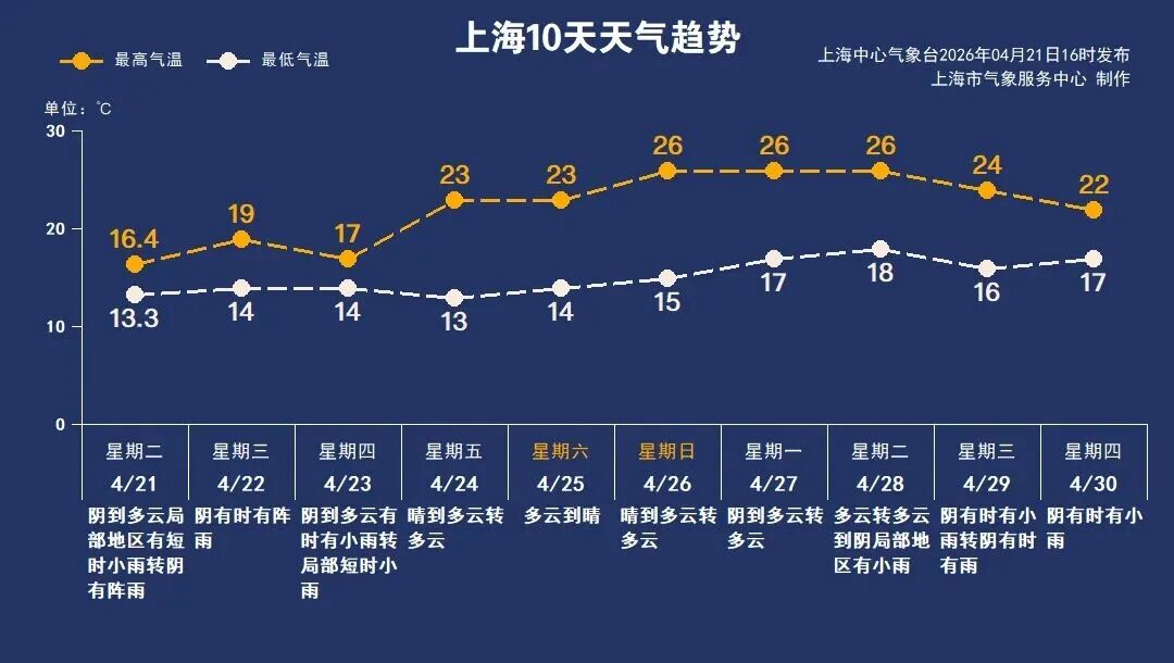周四雨水会减弱,气温只有14~17℃,身体感觉还是比较凉。周五开始天气转晴,气温逐步上升,到了周日和下周一,最高气温会升到26℃左右。昼夜温差再次变大,早上和晚上比较凉,中午比较暖和,大家要注意合理搭配衣物。下周三前后上海还会有一次明显的降水过程,提醒大家关注近期的天气预报。