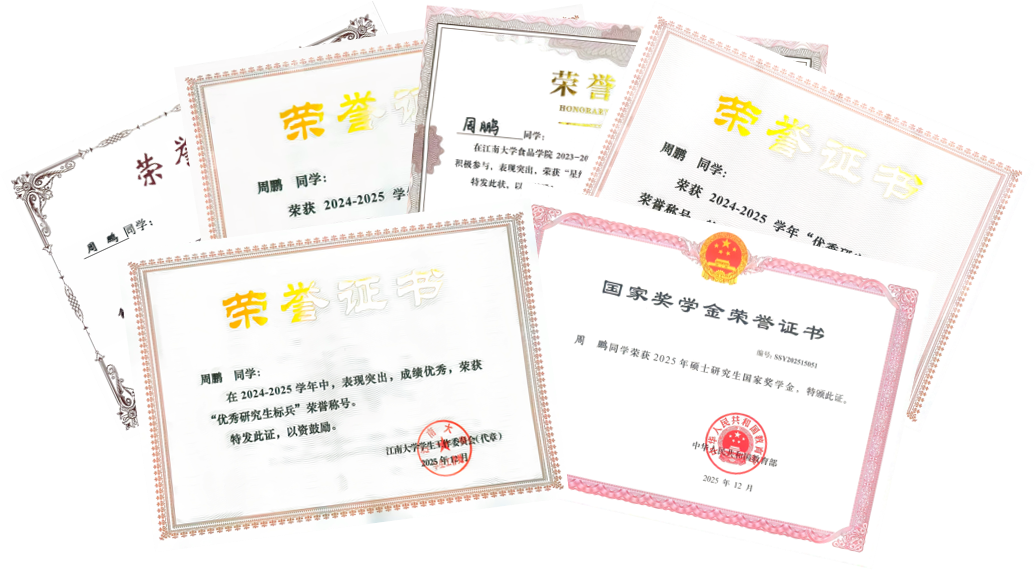 凭借扎实的专业功底与严谨学习态度,周鹏斩获研究生国家奖学金、连续两年获江南大学研究生一等学业奖学金,获评江南大学“优秀研究生标兵”等十余项荣誉。这既是对他潜心科研的充分肯定,也让“把科研做进三餐、融进百姓食材”的初心,一步步落地生根。