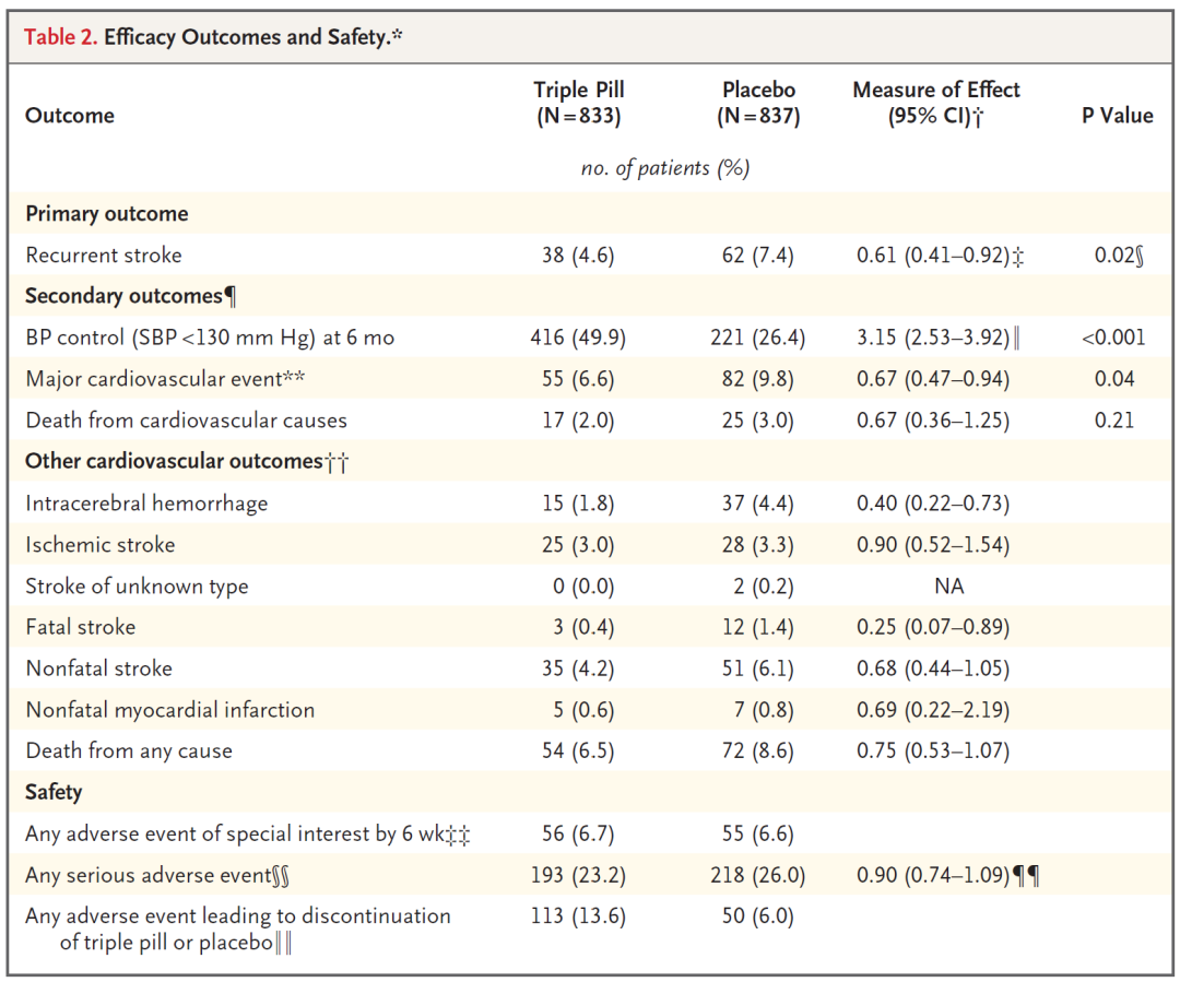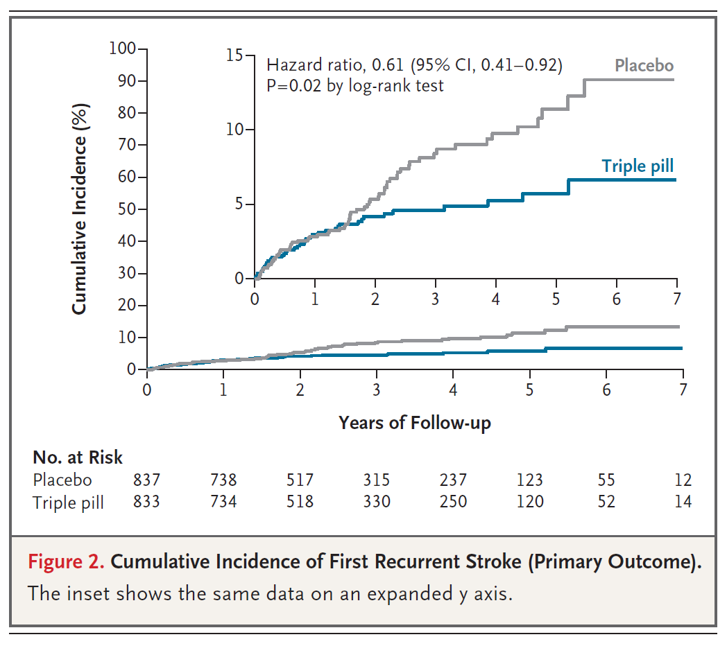 研究结果显示三联复方药片优势显著:平均三年随访期内,服用三联药片的患者卒中复发率为4.6%,安慰剂组为7.4%,前者复发风险降低39%,意味着每治疗35名患者就能预防1例卒中复发