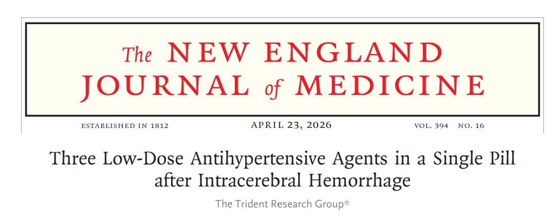 该研究成果以《脑出血后低剂量三联降压药》为题,于北京时间4月23日发表在《新英格兰医学杂志》(The New England Journal of Medicine,NEJM)