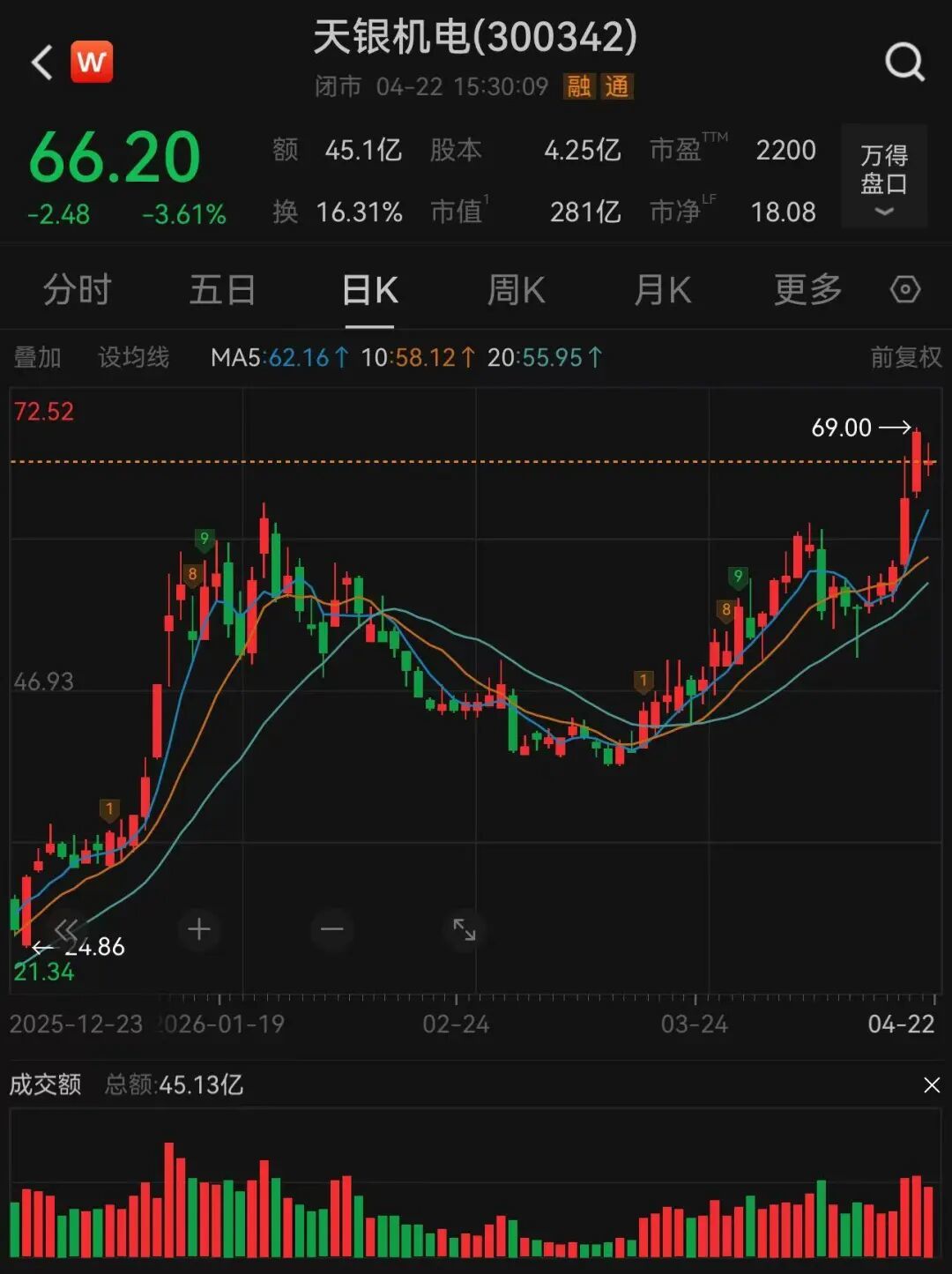 今年年初,天银机电股价从30元/股左右开始上涨,一度触及62.66元/股的高位,之后在3月中旬回调至40元/股左右,随后又再次上扬至目前的66.2元/股,今年以来股价涨幅达到99.82%。