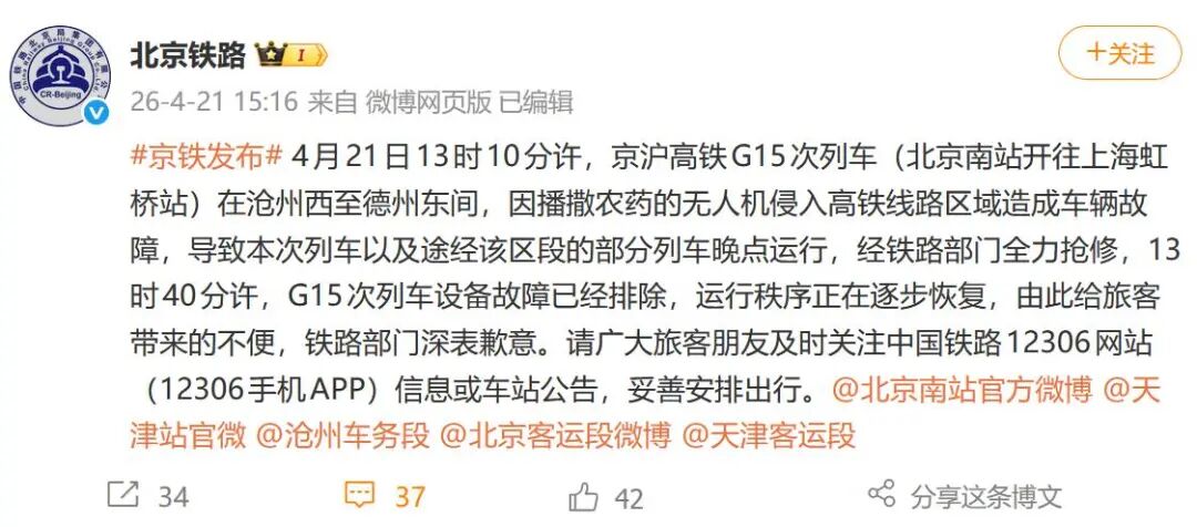 2026年4月21日13时10分许,京沪高铁G15次列车在沧州西至德州东间,因播撒农药的无人机侵入线路区域出现故障,导致该列车及途经区段部分列车晚点。