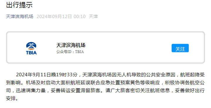 2024年9月11日晚,天津滨海机场因无人机引发公共安全问题,航班起降受影响。截至当晚23时,延误29架次、取消8架次、备降32架次,3000余名旅客出行受阻。