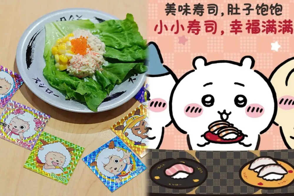 寿司郎标准店面主色调是亮色,分色碟子多为红白黄色,桌面是淡黄色或粉色…屏幕游戏主角是可爱小动物,限时IP联名也是“卡哇伊”风格,比如Chikawa和喜羊羊等。