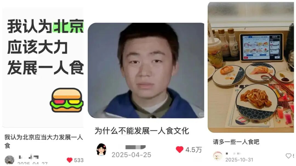 有人分享经历:“一个人吃饭兜兜转转大半天,90%的时间是走向麦当劳。”也有网友吐槽北方菜量太大,“太需要一人食餐厅,一个人吃不完还没法多尝口味”。