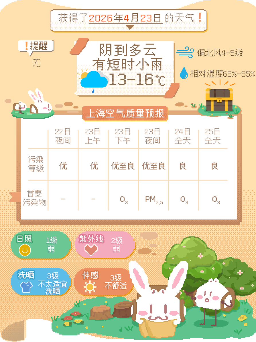 4月23日白天,申城以阴到多云为主,伴有短时小雨,傍晚前后预计转多云。早晨气温普遍在11~12℃,白天偏北风4~5级,相对湿度95%~65%,今日最高气温预计16℃,体感偏凉。