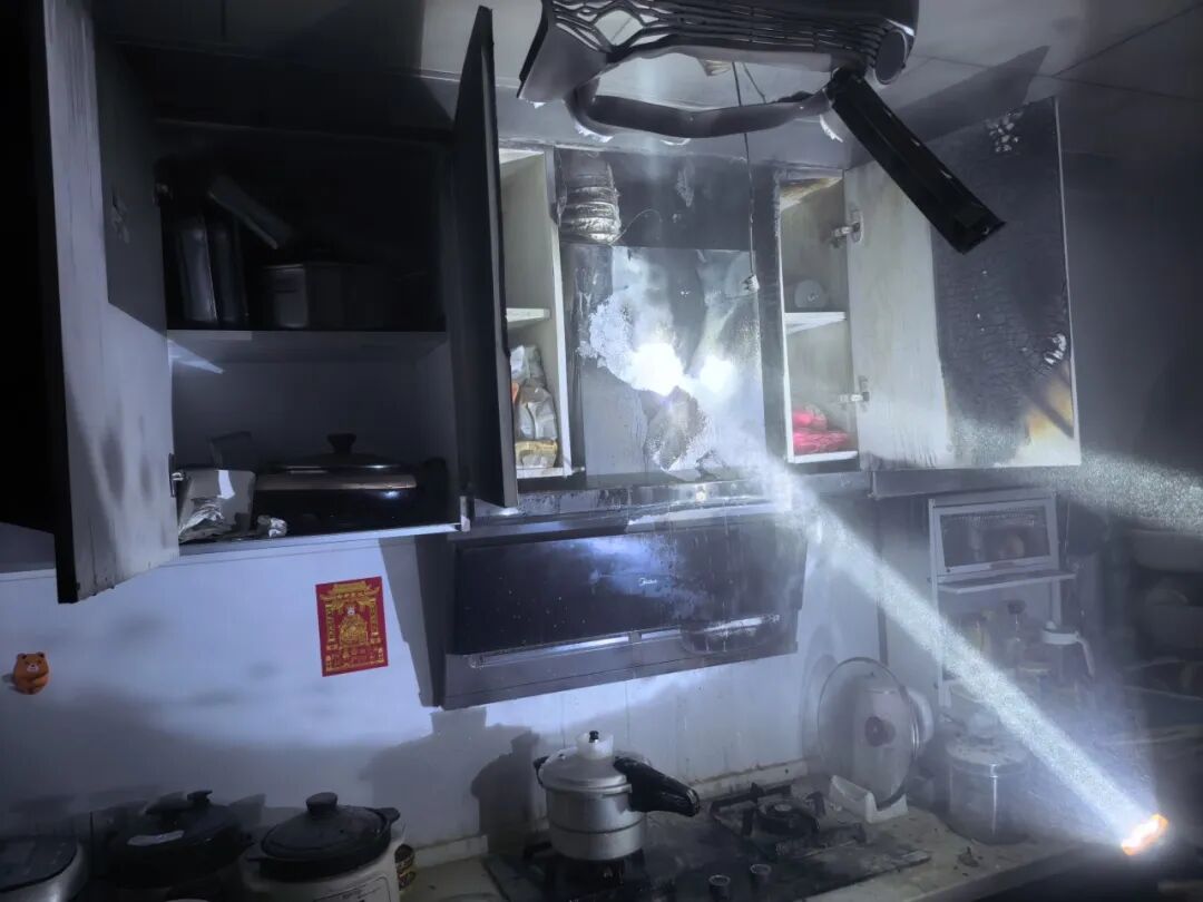 经了解,事发当天,户主的母亲在厨房做饭时,向热油锅中加入一瓢冷水,瞬间蹿起的火焰引燃了沾满油污的油烟机,最终引发火灾。