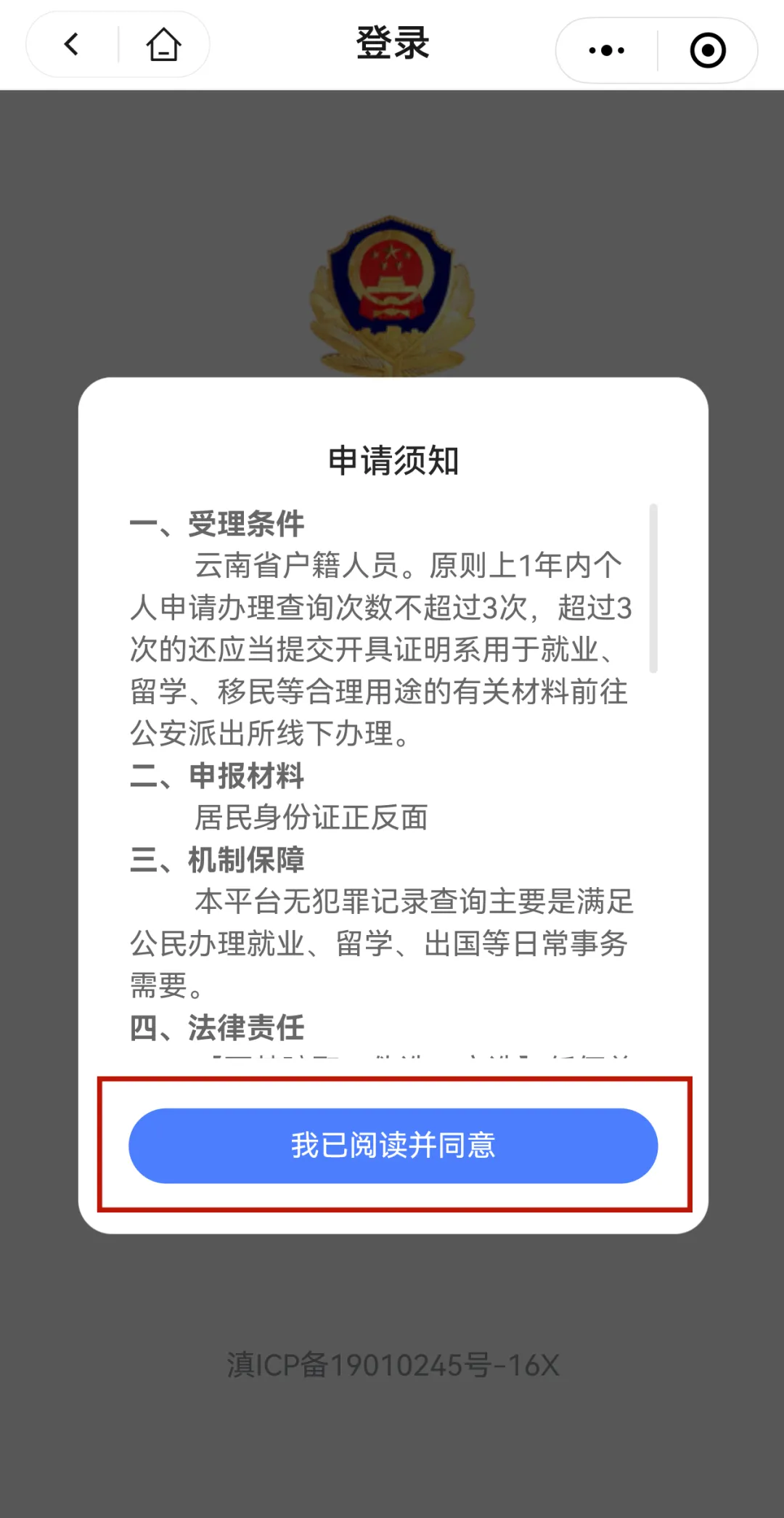 四、认真阅读【申请须知】内容,确认无误后点击【我已阅读并同意】。