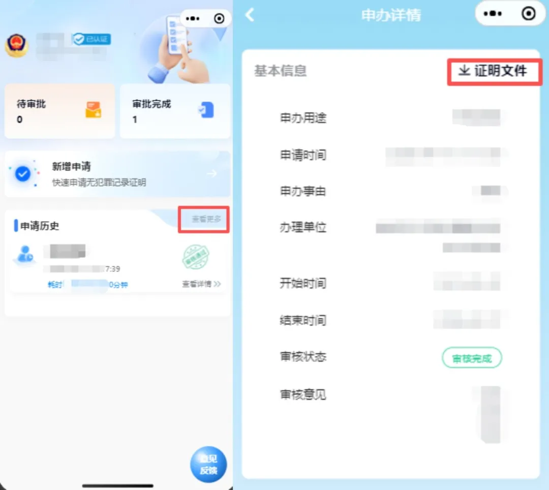 八、申请提交后,受理单位将在3个工作日内完成审批。申请人可通过首页的【申请历史】查看申请详情,并下载电子证明文件。