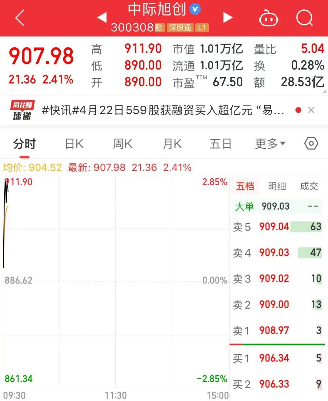 今日早盘,中际旭创股价上扬,盘中市值成功突破万亿元。截至9:34,其市值达到1.01万亿元。