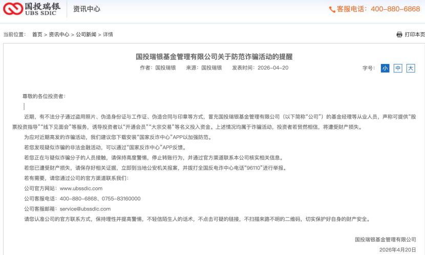 4月20日,国投瑞银发布了本月的第二份防诈骗公告,公告指出近期有不法分子通过盗用照片、伪造身份证与工作证、伪造合同与印章等方式,冒充国投瑞银的基金经理等从业人员,声称可以提供“股票投资指导”“线下见面会”等服务,诱导投资者以“开通会员”“大宗交易”等名义投入资金。