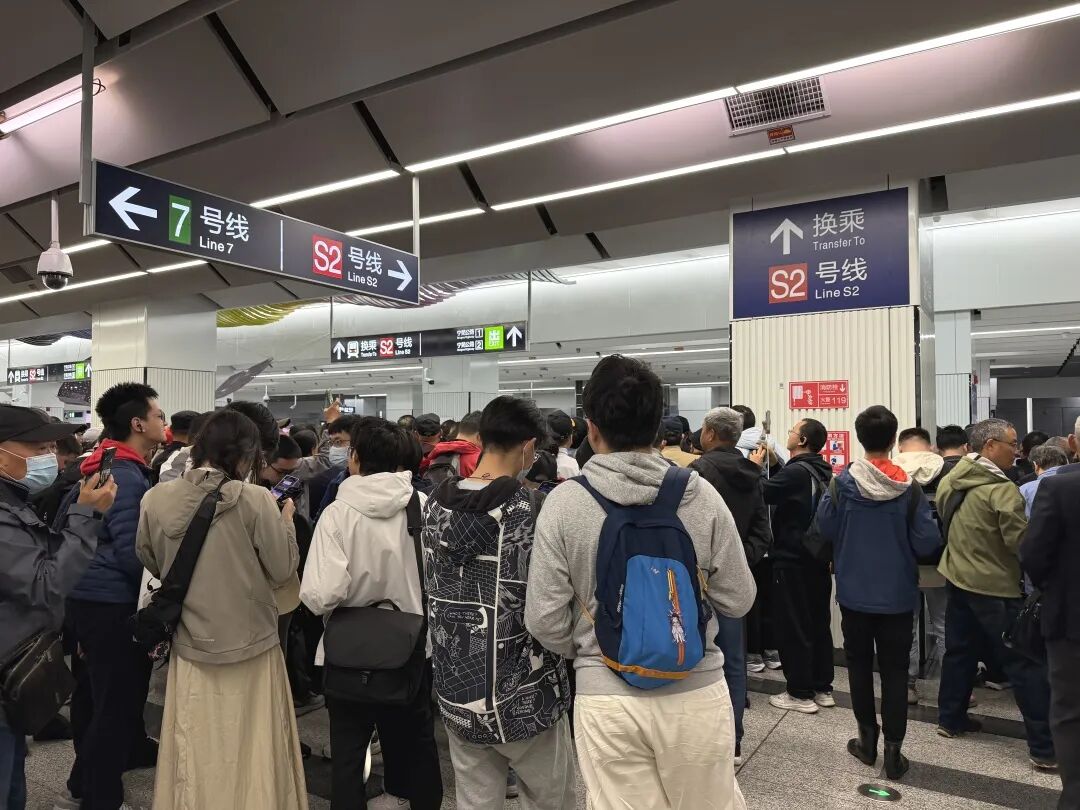 作为一条意义特殊的地铁线路,我们特意到现场体验了首发列车。现场的热闹程度堪比交通领域的名梗“百团大战”,人潮涌动,十分火爆!