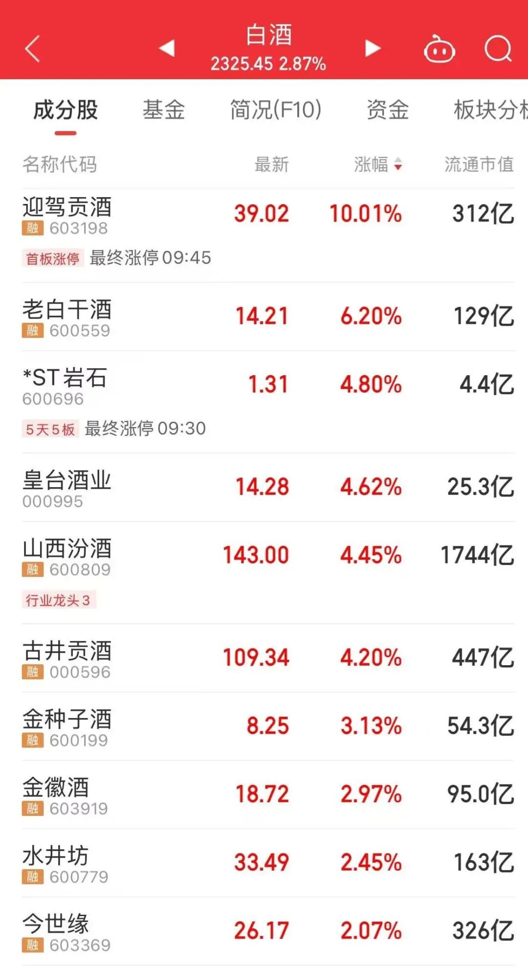 大消费板块上午反弹,白酒板块领涨,迎驾贡酒、老白干酒等个股涨幅较大。贵州茅台股价上涨,超越源杰科技,重新成为A股第一高价股。乳业、食品加工制造、啤酒等板块也随之上涨。