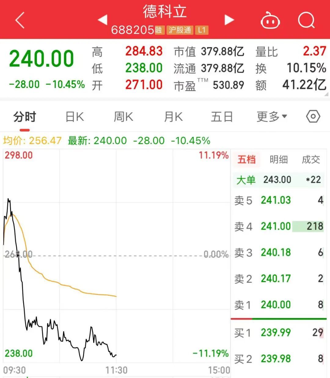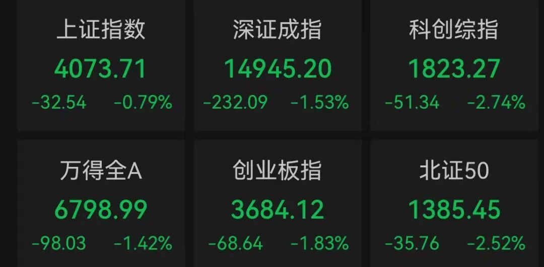 上午收盘时,上证指数下跌0.79%,深证成指下跌1.53%,创业板指下跌1.83%,科创综指下跌2.74%。