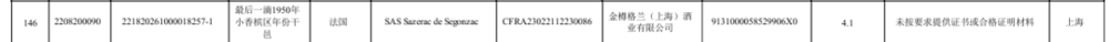 此外,1批次法国“最后一滴1950年小香槟区年份干邑”因“未提供证书或合格证明”未准入境。