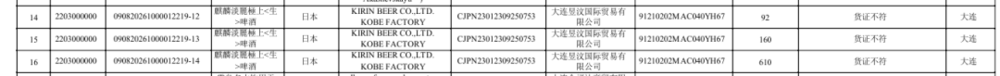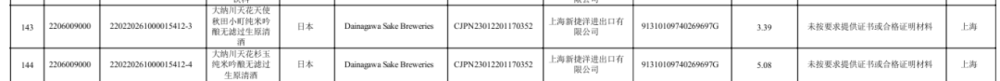 2批次清酒均来自日本,为“大纳川天花天使秋田小町纯米吟酿无滤过生原清酒”“大纳川天花杉玉纯米吟酿无滤过生原清酒”,因“未提供证书或合格证明”被拒。3批次日本麒麟生啤酒因“货证不符”未准入境。