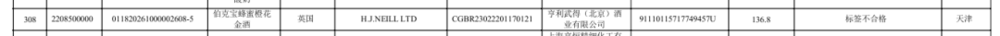 5批次利口酒、杜松子酒中,德国野格、荷兰迪可派西瓜味利口酒、英国伯克宝蜂蜜橙花金酒上榜,分别因“申报含罂粟籽”“诱惑红超标”“标签不合格”被拒。