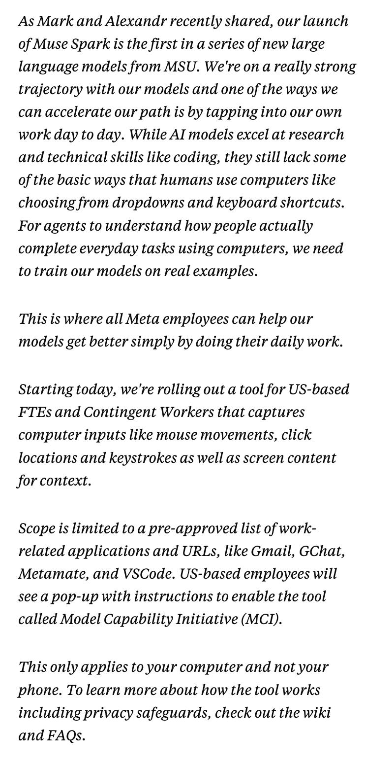 备忘录里有句话格外扎眼:「这正是所有Meta员工通过日常工作中的一举一动,帮助我们的模型变得更好的机会。」