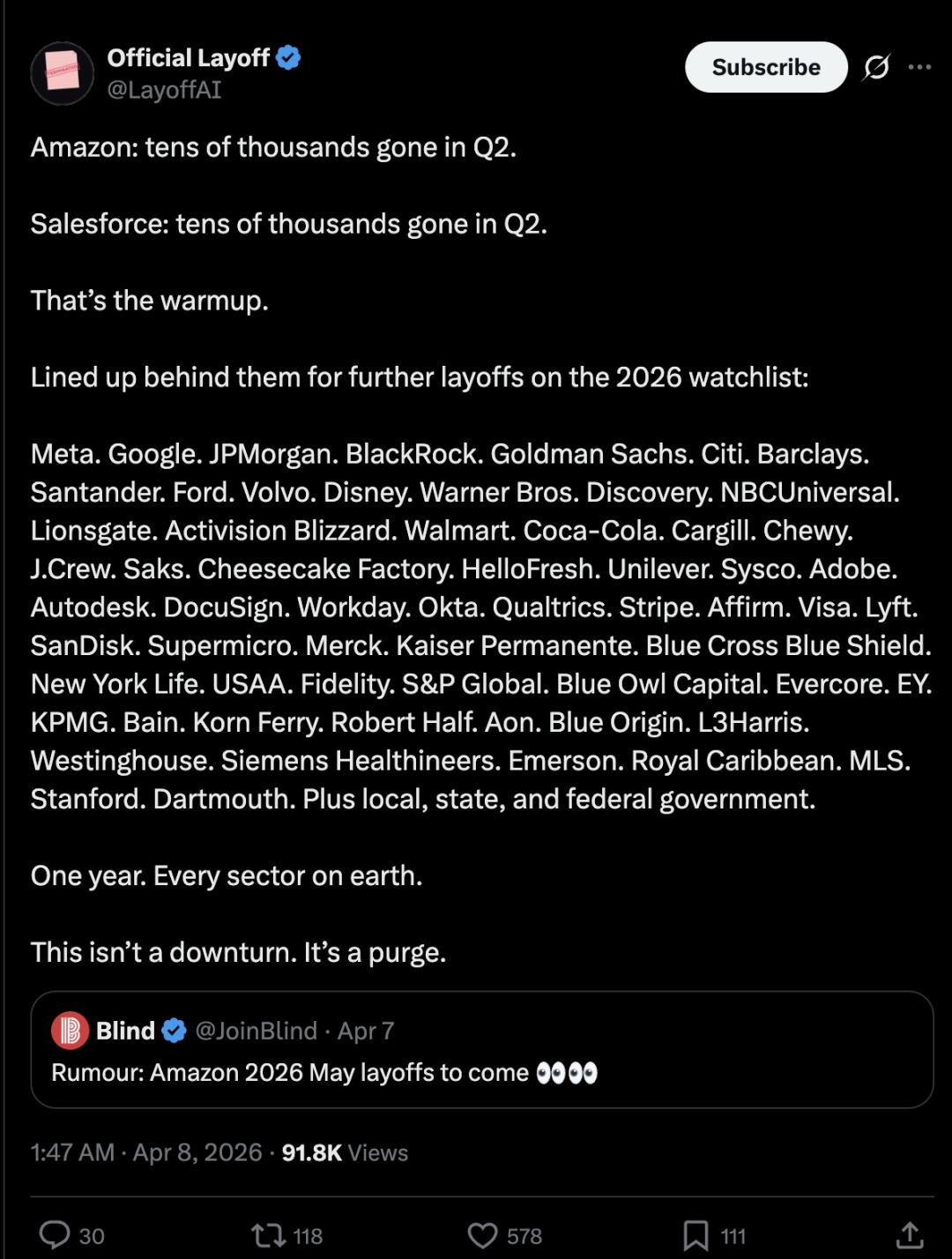 实时追踪裁员动态的Official Layoff放出惊人言论:「一年后,裁员将席卷全球所有岗位!」