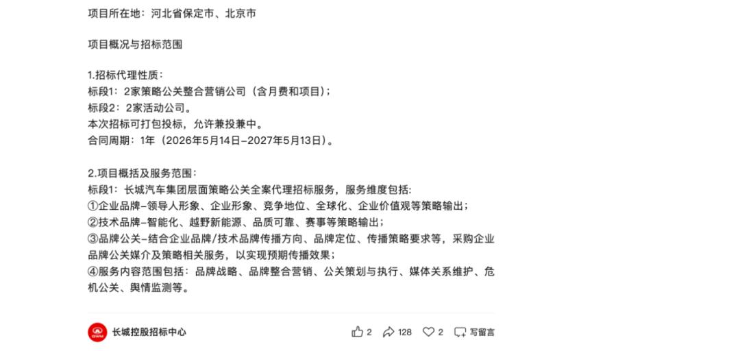 值得注意的是,魏牌已意识到营销短板,正寻求外部支持,公开招标营销服务商。根据长城控股招标中心1月公告,长城为2026年招标有成熟经验的整合营销与活动公司,服务涵盖品牌战略、整合营销及舆情维护等。